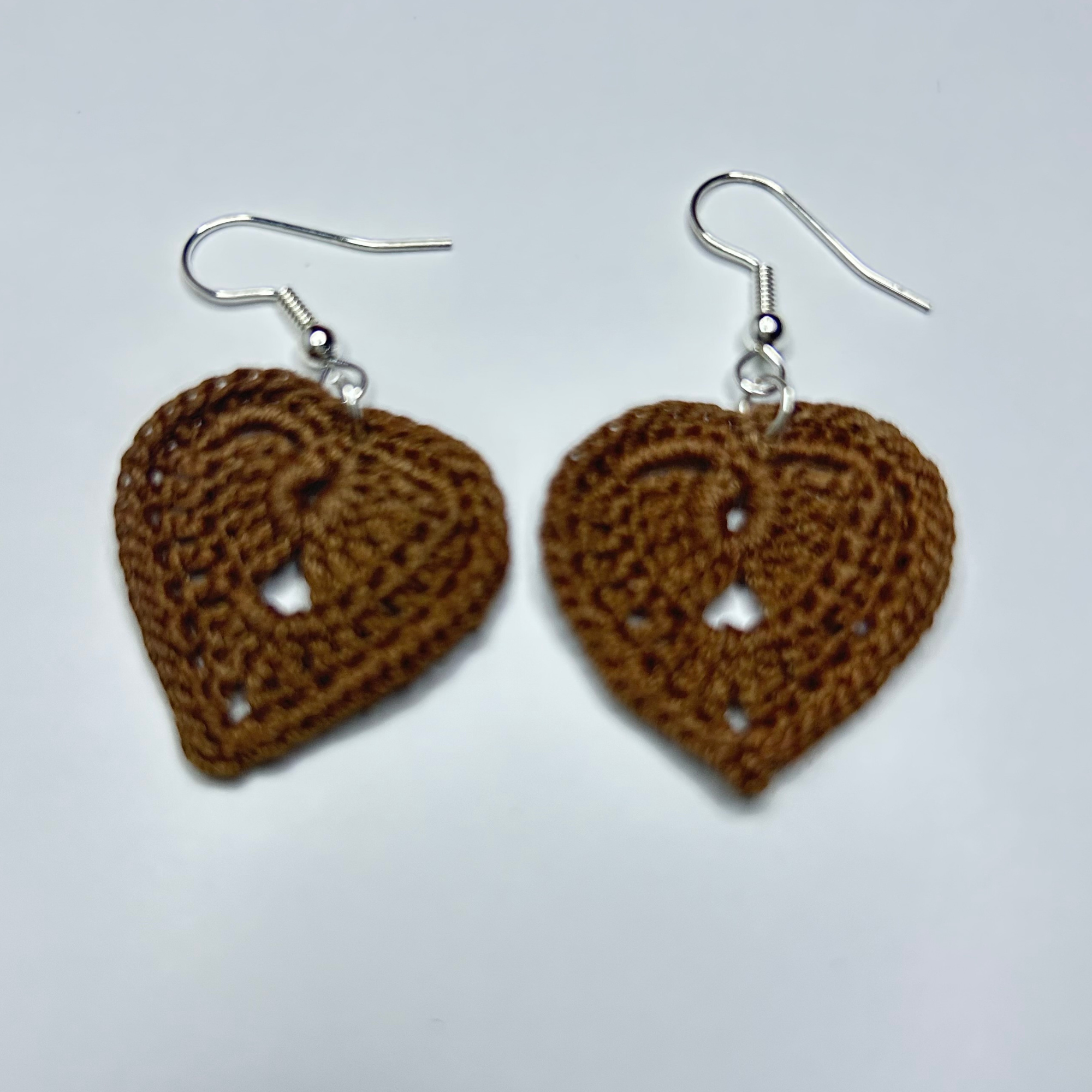 Handmade brown heart crochet earrings with lightweight detail and an easy statement finish.