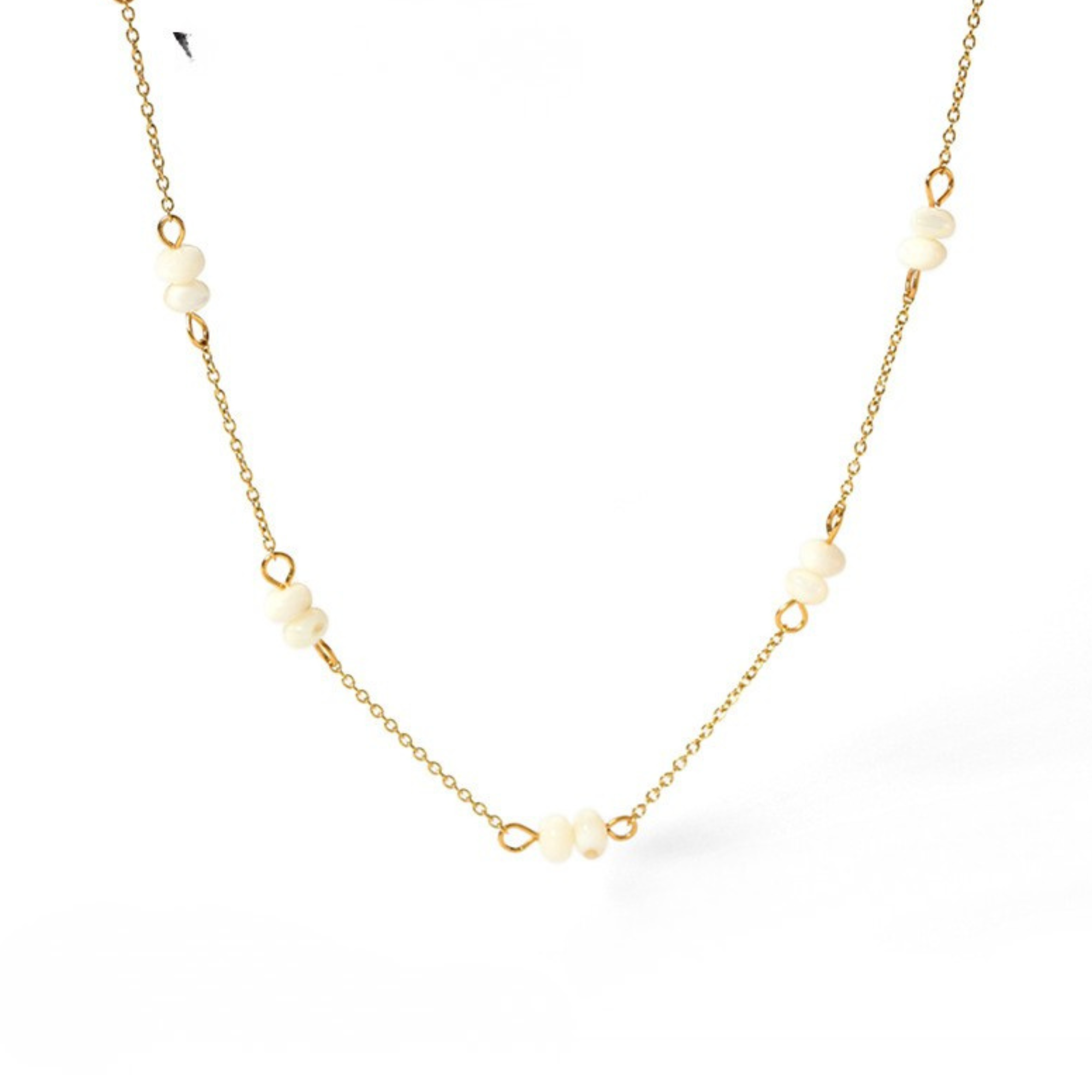 White Bead Accents Necklace is a minimal chain necklace finished with spaced white beads for a clean and delicate look. It is lightweight, easy to style, and ideal for layering or wearing on its own.